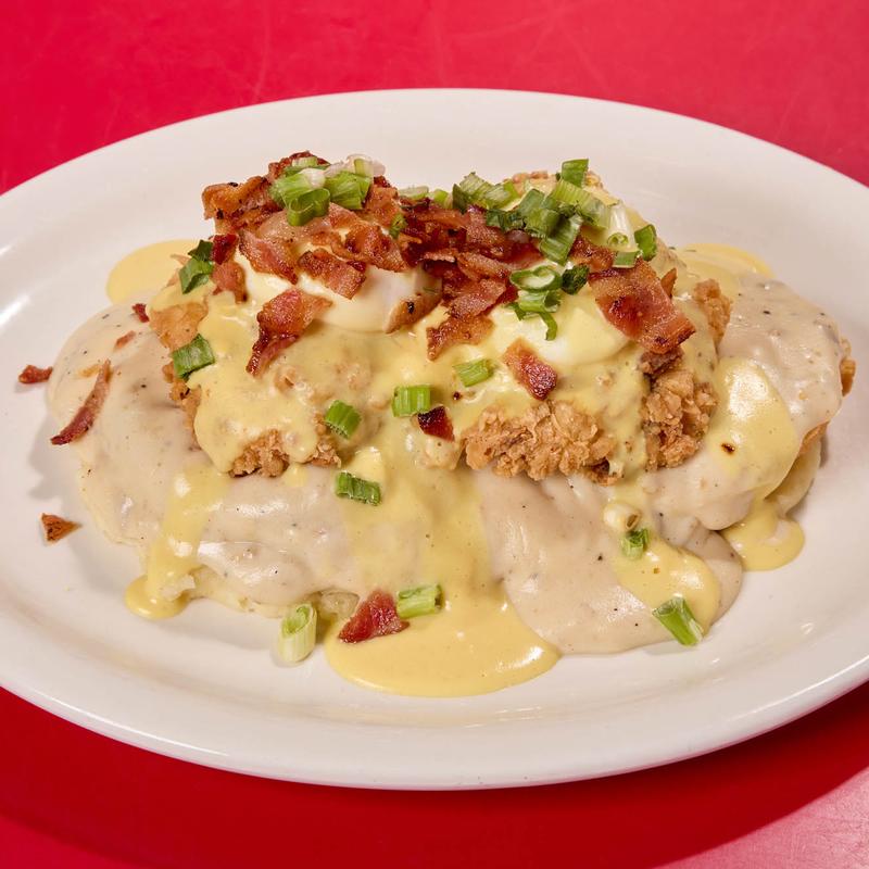 All skillets are served with two eggs any style on a bed of country potatoes that are topped with your choice of hollandaise sauce or country gravy. Served with toast, a biscuit, or a single pancake.